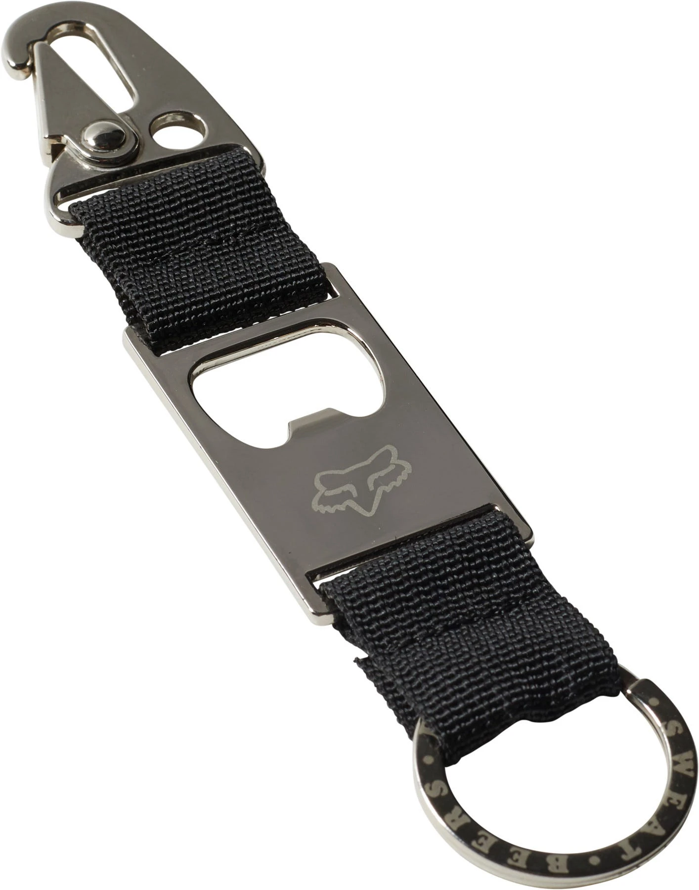 - Zinc alloy-hook and bottle opener, iron-ring, polyester-webbing