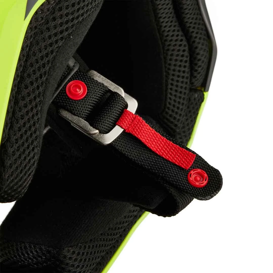 - Steel D-ring chin strap closure