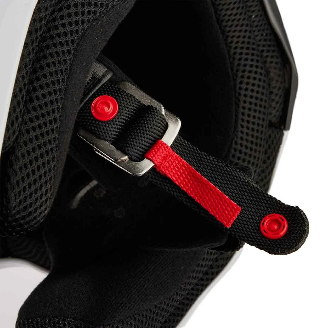 - Steel D-ring chin strap closure